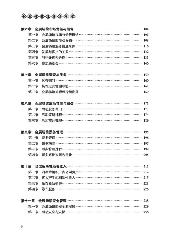 本书通过十一个章节对内容进行了阐述。第一章从会展场馆的定义、分类与功能对中外会展场馆的发展与演进进行了概述;第二章从规划和工程的角度对会展中心独特的建筑体功能要求和合理规划进行了简述;第三章到第十一章围绕会展场馆运营与管理的九大功能展开,内容包括:会展场馆的行政管理、财务管理与结算、场馆预订、营销和销售、票务管理、配套服务、场馆运营管理、活动现场管理以及安全和安保。
